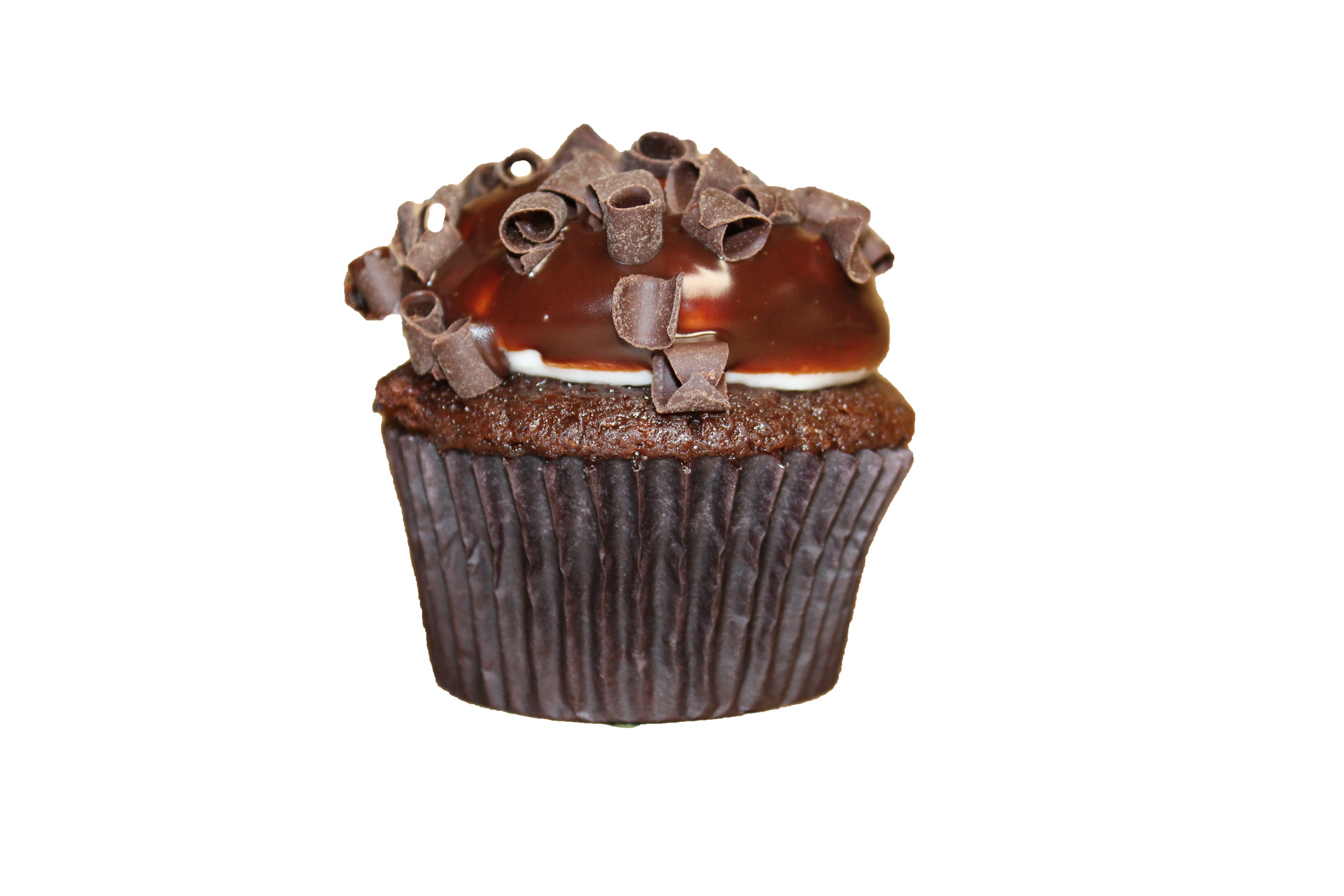 Chocolate cupcake injected and frosted with whipped cream, dipped in chocolate ganache and topped with chocolate curls.